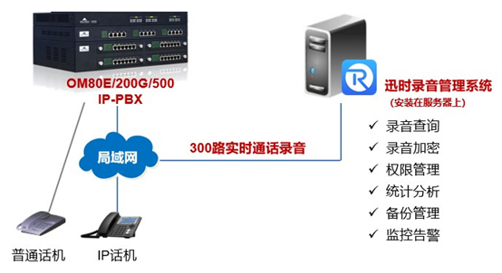 在上面的迅時電話錄音解決方案中,除了OM系列IP電話交換機和MX系列語音網關外,迅時電話錄音管理系統也扮演了重要角色。它集電話錄音文件的收集、存儲、查詢回放及管理于一體,滿足大中型企業或呼叫中心對電話錄音可靠性、安全性、實用性、大容量管理及高性價比的要求。