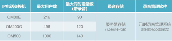 - 高并發錄音:單臺OM系列IP電話交換機(IP-PBX)支持大于100路的電話錄音,支持多臺設備堆疊,最大支持300路實時電話錄音。