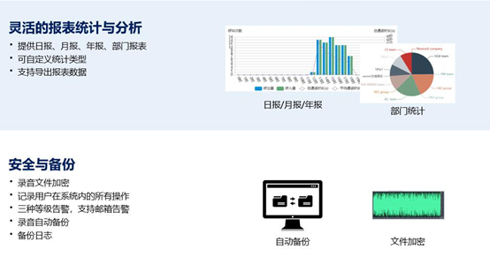 - 專業管理:支持錄音查詢、多級權限管理、統計分析、錄音加密、自動備份等功能。