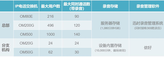 - 分布式錄音,集中式管理:分支機構部署OM系列小型IP電話交換機(IP-PBX),電話錄音內置存儲;總部部署OM系列大中型IP電話交換機和迅時錄音管理系統,統一管理總部和各分支機構的電話錄音。