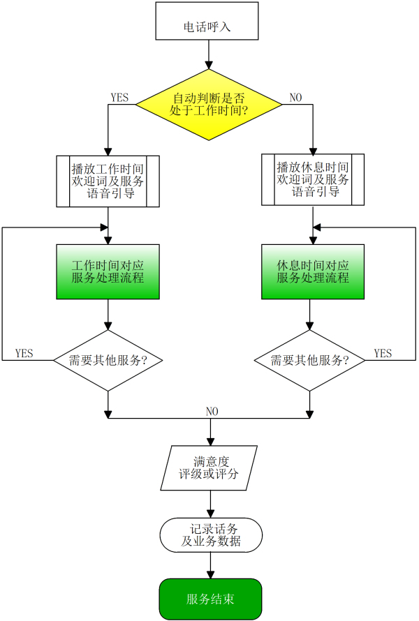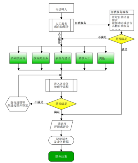人工服務功能業務受理主要包括:咨詢類業務、投訴類業務、建議表揚業務、會員業務、商業加盟、內部員工及供應商申訴等,主流程圖如下圖所示: