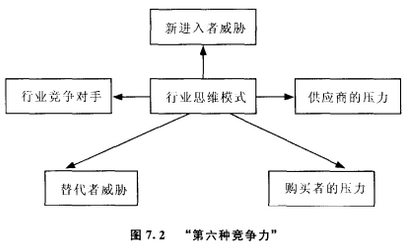 (3)挑戰突破:適應行業變化。鮑曼(Bowman,1992)通過繪制一般性戰略的混合體跨越時間的運動,尋求發展波特的“一般性戰略”的概念。托尼·格倫迪通過確認行業競爭環境的關鍵性因素,提出“競爭行業思維模式”,并把它確立為“第六種競爭力”,從而發展了波特的競爭力模型。如圖7.2所示。