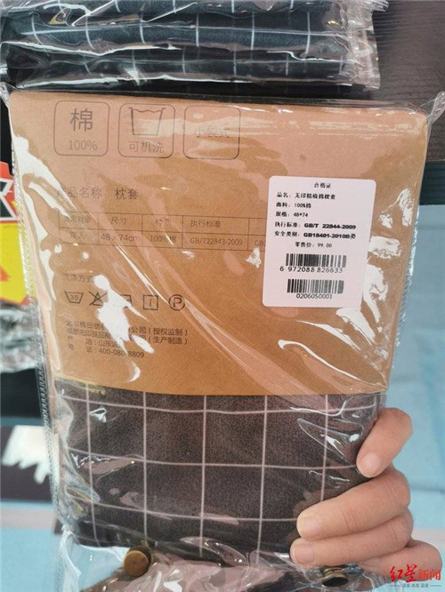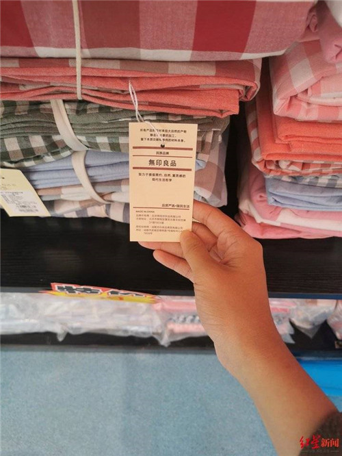 此外,記者在成都多家商場走訪發現,有不少無印良品的柜臺或展銷攤位在售賣。在位于盛和一路的一家大型連鎖超市一樓,除了一些實體商鋪,還有許多展銷攤位。其中一個攤位寫著“無印良品natural mill,全場3-5折”,售賣床單、被套等商品,銷售人員熱情的介紹該商品為正品的無印良品,現在促銷價一套售價899的被套套裝只需400多元。記者注意到,該攤位的店招宣傳設計與日本無印良品相似,紅底白字,細微區別在該攤位無印良品下方有natural mill,字號偏小,不易看到,而日本的則是在無印良品上方有muji字母。另外,商品標簽上只有無印良品的字眼,生產商為江蘇黛恒家居科技有限公司,并設有防偽碼。