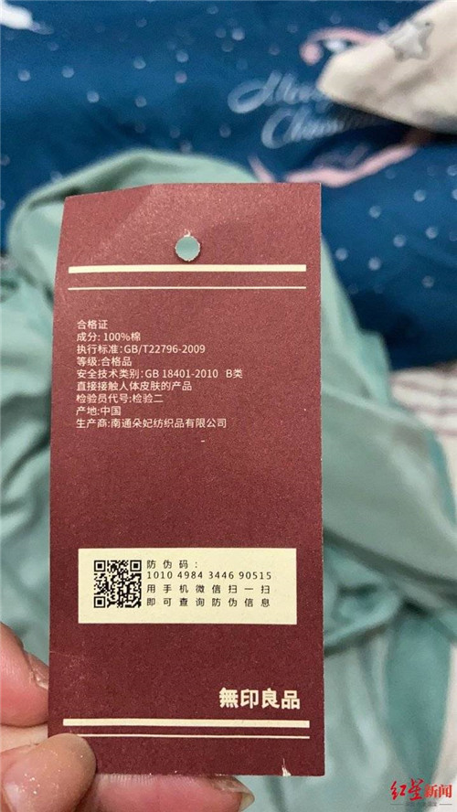 前幾天,于女士收到貨,拆開仔細看了看,發現商標細節、手感和平時在實體店購買的不太一樣,“日本的無印良品商標上有muji字母,這個沒有?!庇谂坎榭戳松虡松系纳a商家為江蘇南通朵妃紡織品有限公司,跟日本的完全是兩回事,因此,她懷疑自己購買的商品并非日本品牌“無印良品”。