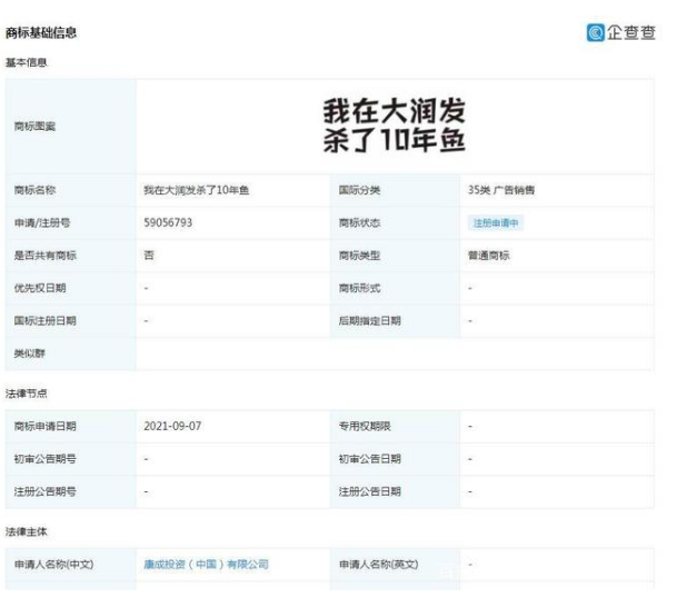 據企查查APP資料顯示,大潤發超市所屬的康成投資(中國)有限公司,在今年9月注冊申請了一件“我在大潤發殺了10年魚”商標,商標國際分類為35類廣告銷售,目前的商標狀態為注冊申請中。