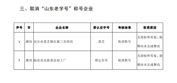 整改結果顯示:此前因商標權屬問題等原因要求限期整改的13家企業中,7家企業整改合格(3家企業的單位名稱發生變更);4家企業因商標權屬不清晰、列入失信名單等原因,繼續整改;值得注意的是,來自濰坊和德州的兩家企業因無商標所有權,被取消“山東老字號”稱號。