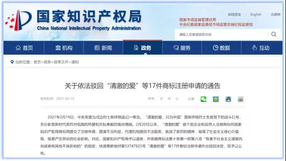 3月15日,國家知識產權局發布通告,依據商標法第十條第一款第(八)項“有害于社會主義道德風尚或者有其他不良影響的”的規定,對“清澈的愛”等17件商標注冊申請作出駁回決定。