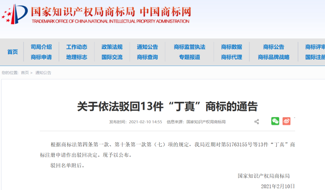 關(guān)于依法駁回13件“丁真”商標(biāo)的通告