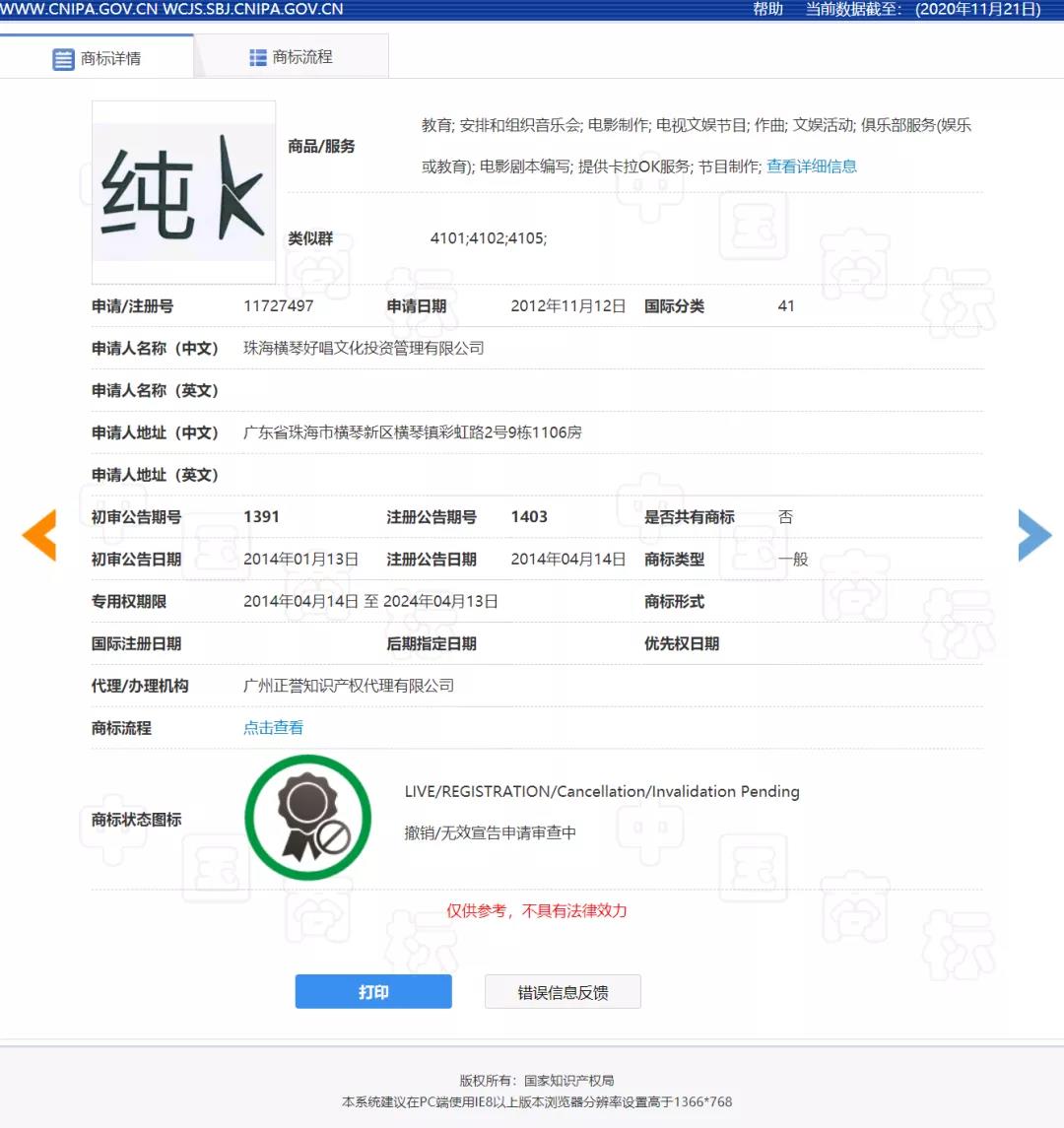 唱K已經(jīng)是現(xiàn)代都市生活不可或缺的娛樂活動,嗨唱之余,或曾注意那霓虹燈下閃亮的燈牌?日前,多家公司就因這KTV的門店招牌走進(jìn)法院……因?yàn)橹楹:贸幕荆ㄏ挛暮喎QA公司)依法享有第11727497號“純K”和第11727503號“純K”注冊商標(biāo)的專用權(quán),核定服務(wù)項(xiàng)目均為第 41 類:文娛活動;俱樂部服務(wù)(娛樂或教育);提供卡拉 OK 服務(wù);且該商標(biāo)還處于注冊有效期內(nèi),有著巨大的品牌價(jià)值和商業(yè)利益。
