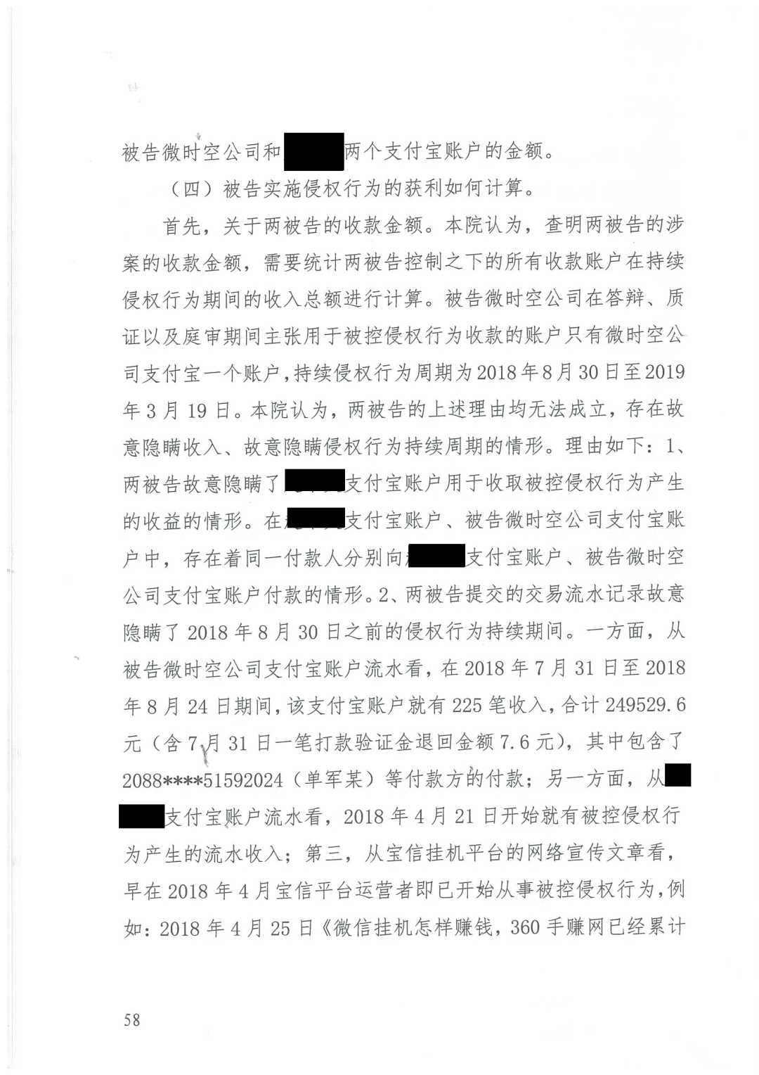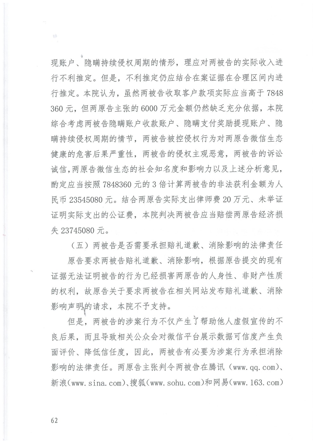 法院查明,被告向托管微信賬號支付的提現獎勵與向客戶收取的刷量報酬比為5:1。結合兩被告有相關隱瞞情形,存在侵權主觀惡意等,法院最終推定按照合計收取客戶款項7848360元的3倍計算非法獲利金額為23545080元。