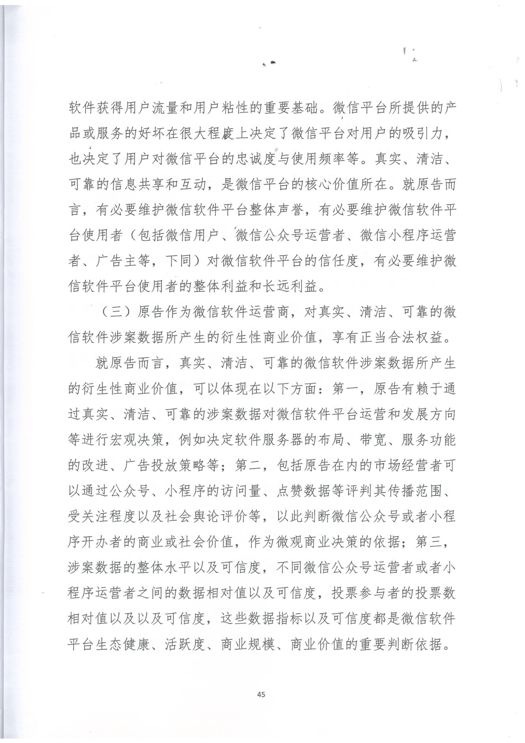 原被告雙方都圍繞微信從事軟件產品開發與服務,存在直接利益沖突,是反不正當競爭法意義上的競爭關系:騰訊維護微信數據的清潔性、真實性,構建用戶對微信數據的信任和需求;兩被告的經營活動,一方面有賴于相關公眾對騰訊搜集、統計、展示、分析數據的信任,另一方面則破壞微信數據的信任體系,打擊相關公眾對可信任數據的需求。