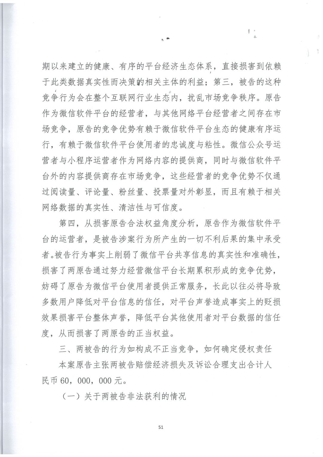 騰訊表示,微信公眾號、小程序上設置“閱讀量”、“評論”、“粉絲”、“投票”等功能模塊,是微信評價體系的重要組成部分。被告方的刷量業務會導致消費者對微信公眾平臺的公正性產生質疑,破壞微信生態,擾亂市場競爭秩序,給騰訊的商譽造成損害,構成不正當競爭。