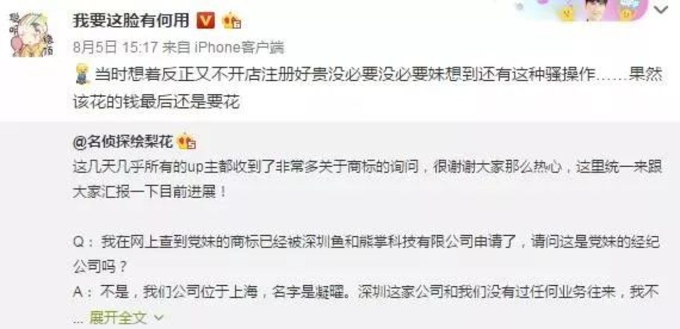 即便有UP主有這樣的意識(shí),由于商標(biāo)注冊(cè)前還需注冊(cè)個(gè)體工商戶進(jìn)行掛靠,一些草根UP主也無從下手。此次搶注事件后,被搶注了商標(biāo)的B站UP主“機(jī)智的黨妹”便發(fā)微博稱:“當(dāng)時(shí)想著反正又不開店注冊(cè),(商標(biāo)注冊(cè))好貴,沒必要沒必要,沒想到還要這種騷操作……果然該花的錢還得花。”